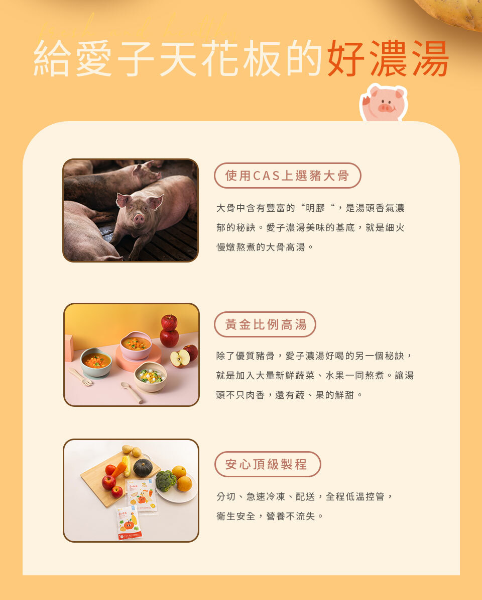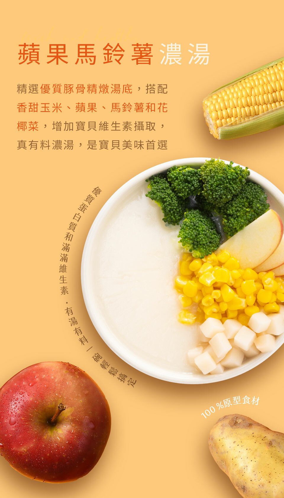 精選優質豚骨精燉湯底,搭配香甜玉米、蘋果、馬鈴薯和花椰菜,增加寶貝維生素攝取,真有料濃湯,是寶貝美味首選。